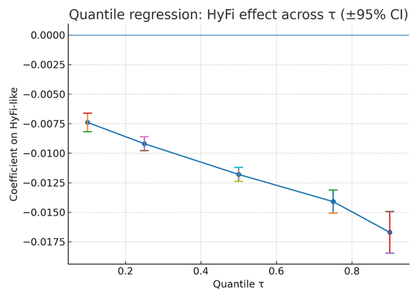 . Points show estimates for the HyFi-like dummy; vertical bars are ±95% intervals using reported standard errors. Estimates become more negative at higher quantiles, indicating stronger stabilization in the tails.